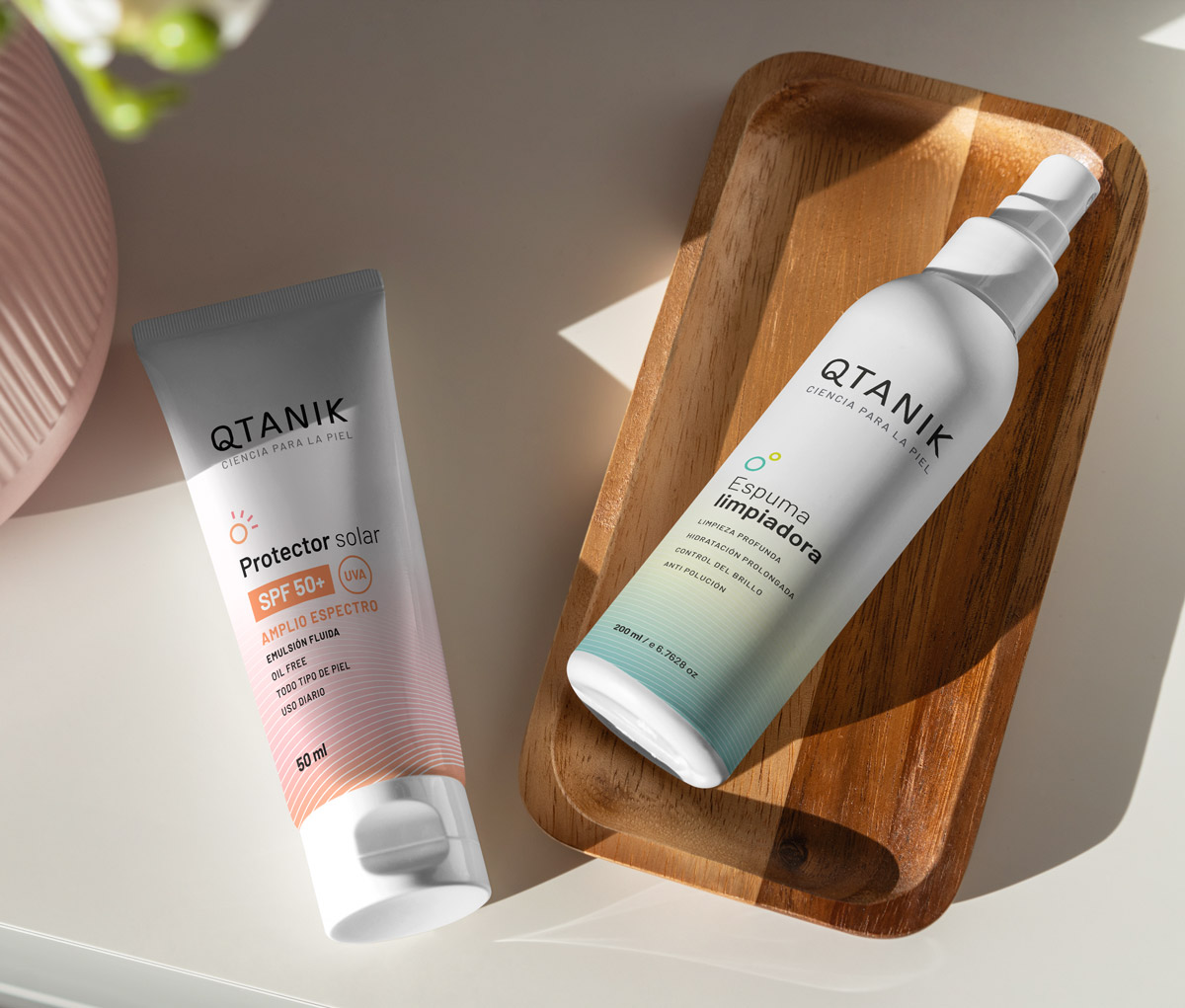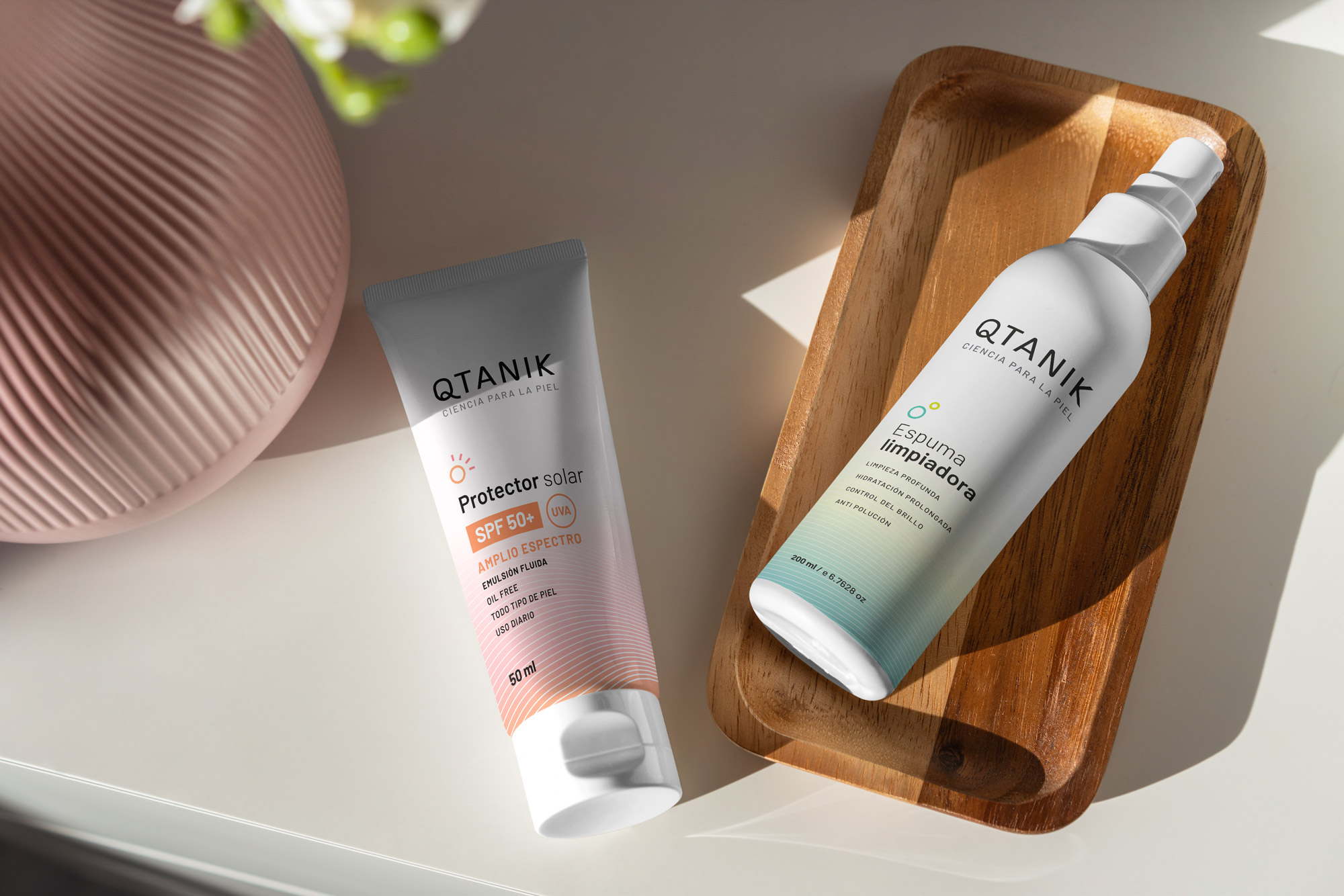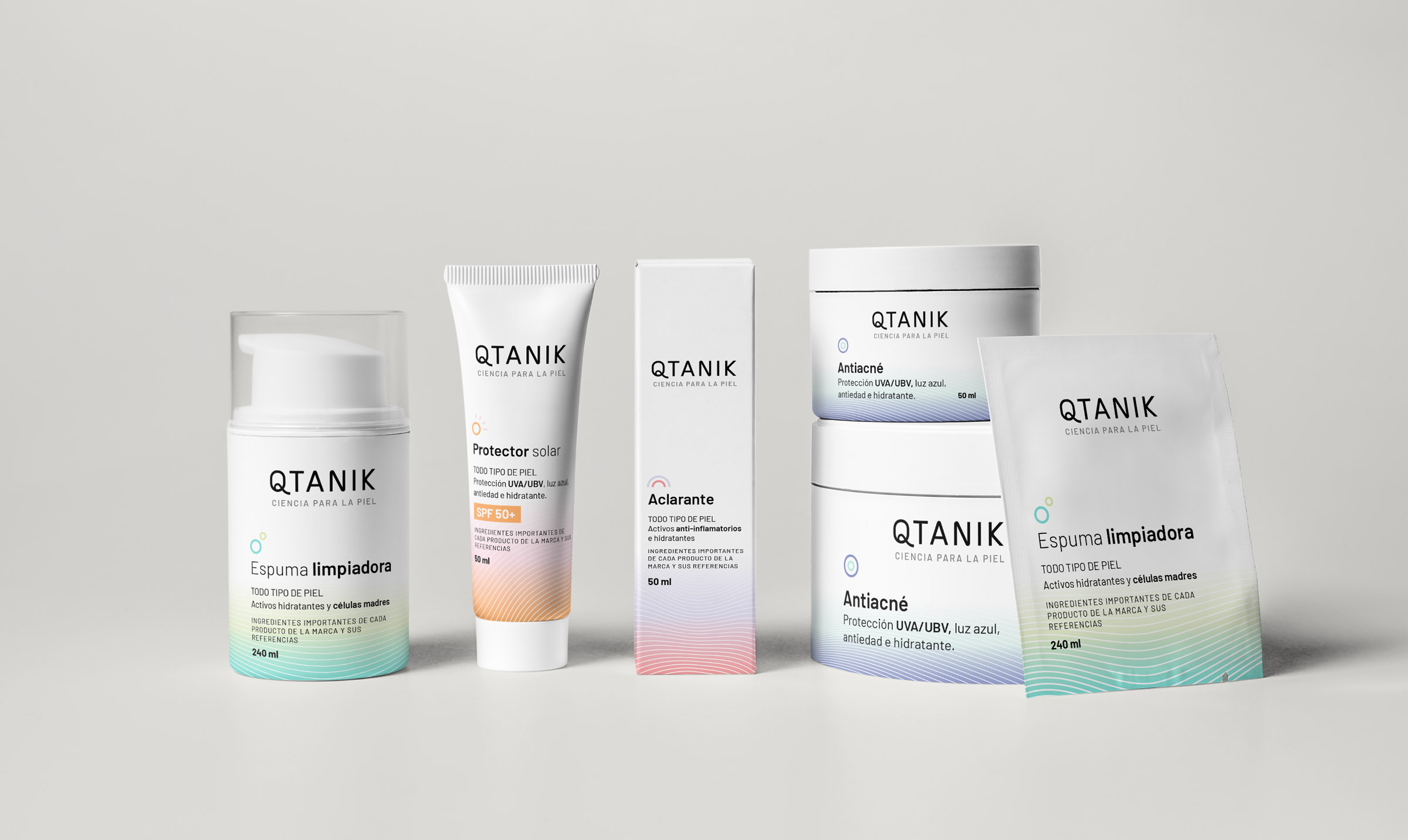 El blanco como protagonista y el uso de color como acento logran una comunicación coherente con el aspecto científico y joven de la marca.
