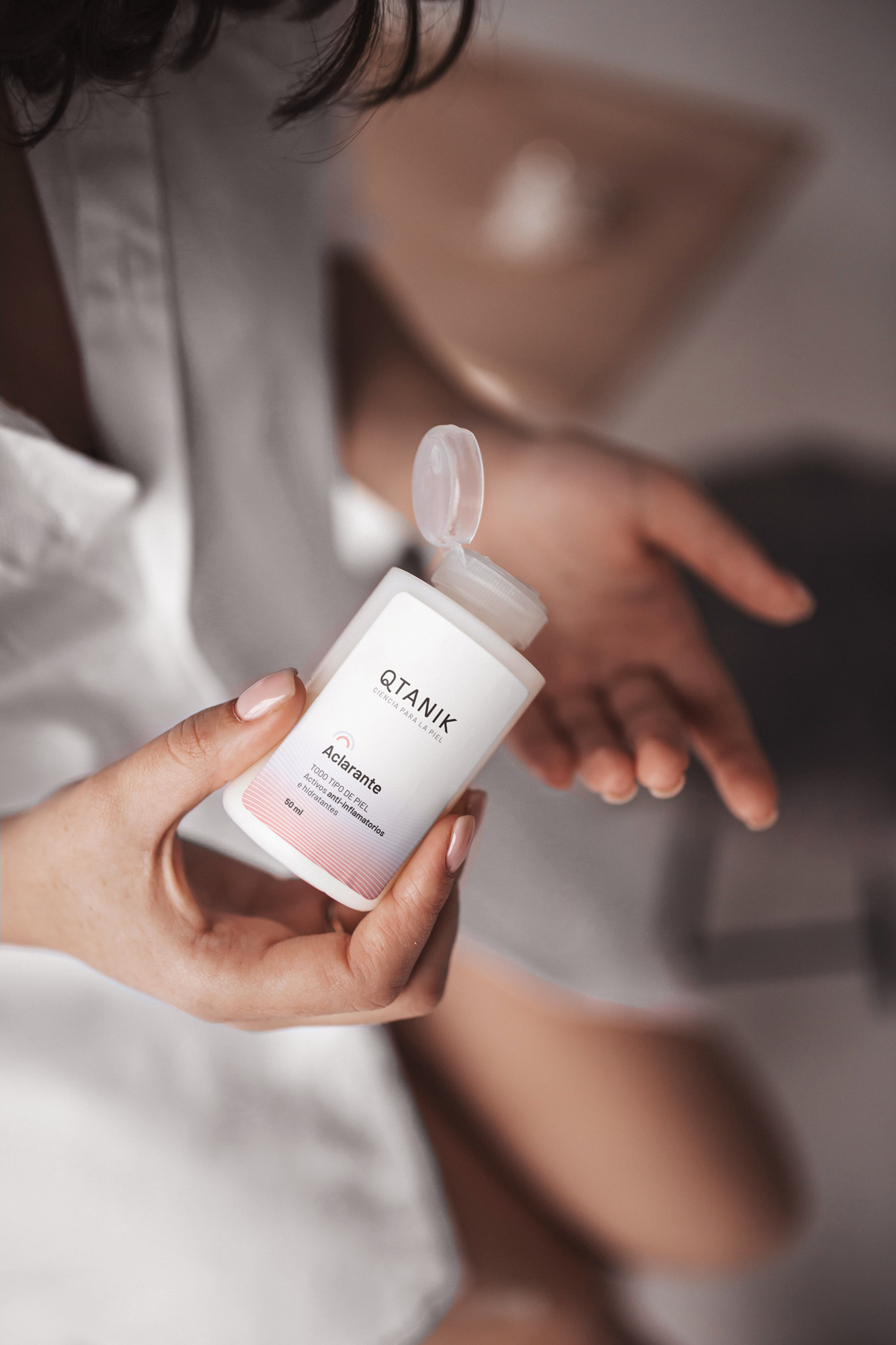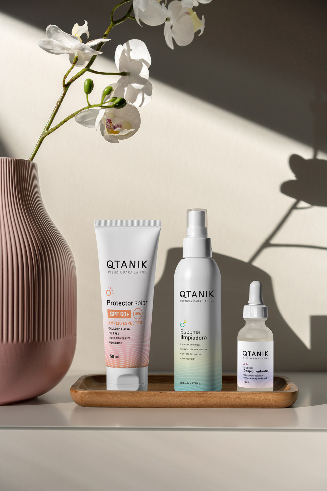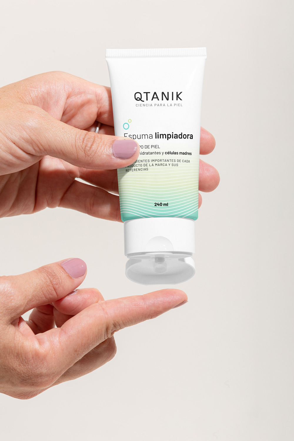 El blanco como protagonista y el uso de color como acento logran una comunicación coherente con el aspecto científico y joven de la marca.